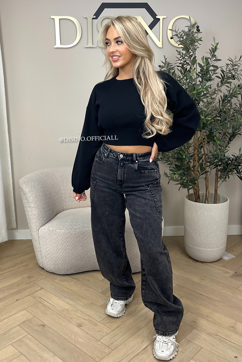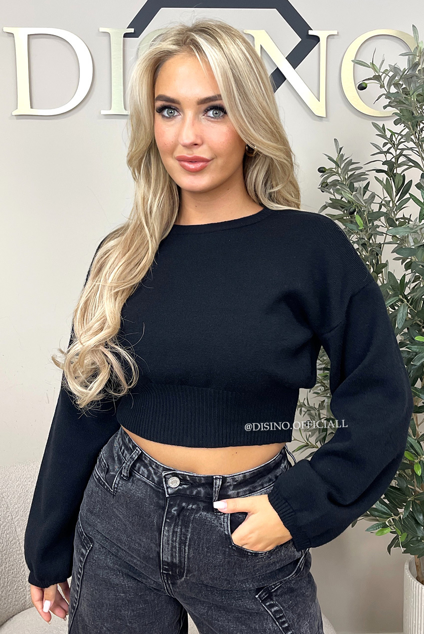black cropped knit, basic knit dames, trui met ballonmouwen zwart, cropped sweater dames, knit top dames herfst, trendy knit DISINO, black knit top, cropped pullover dames