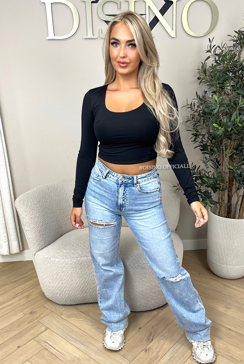 BLACK - 'KIMMSS CROPPED TOP' - PERFECT FIT V-NECK LONG SLEEVE TOP