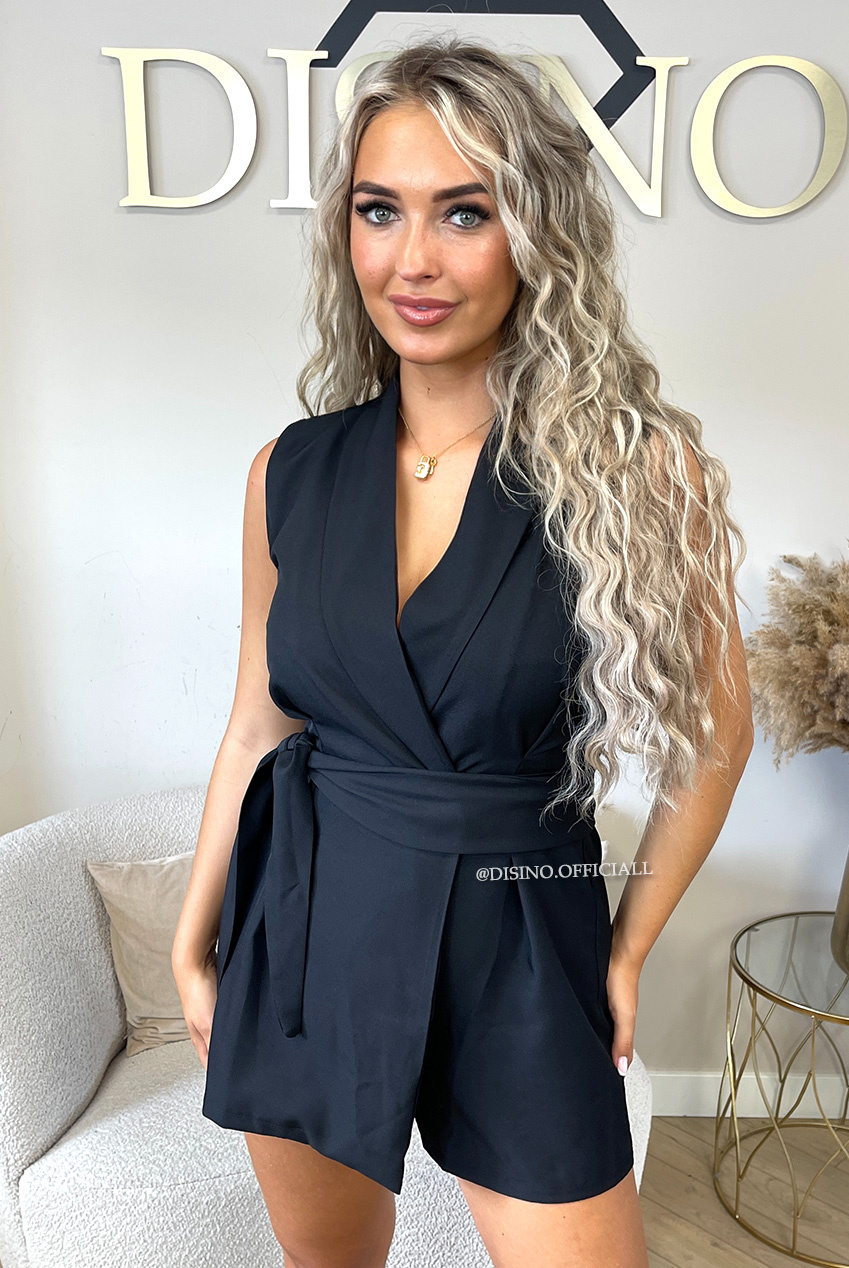 SEO-zoektermen: zwarte playsuit dames, trendy playsuit 2025, classy playsuit zwart, chique playsuit met ceintuur, elegante playsuit dames, playsuit zonder mouwen, DISINO playsuit zwart