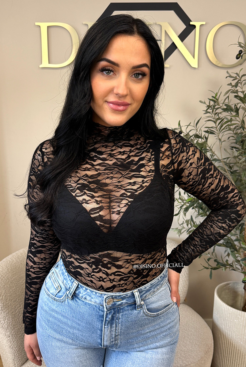 SEO-zoektermen: lace bodysuit dames, zwarte body dames, kanten body dames, lange mouw body dames, elegante body dames, party top dames, DISINO body, black lace body