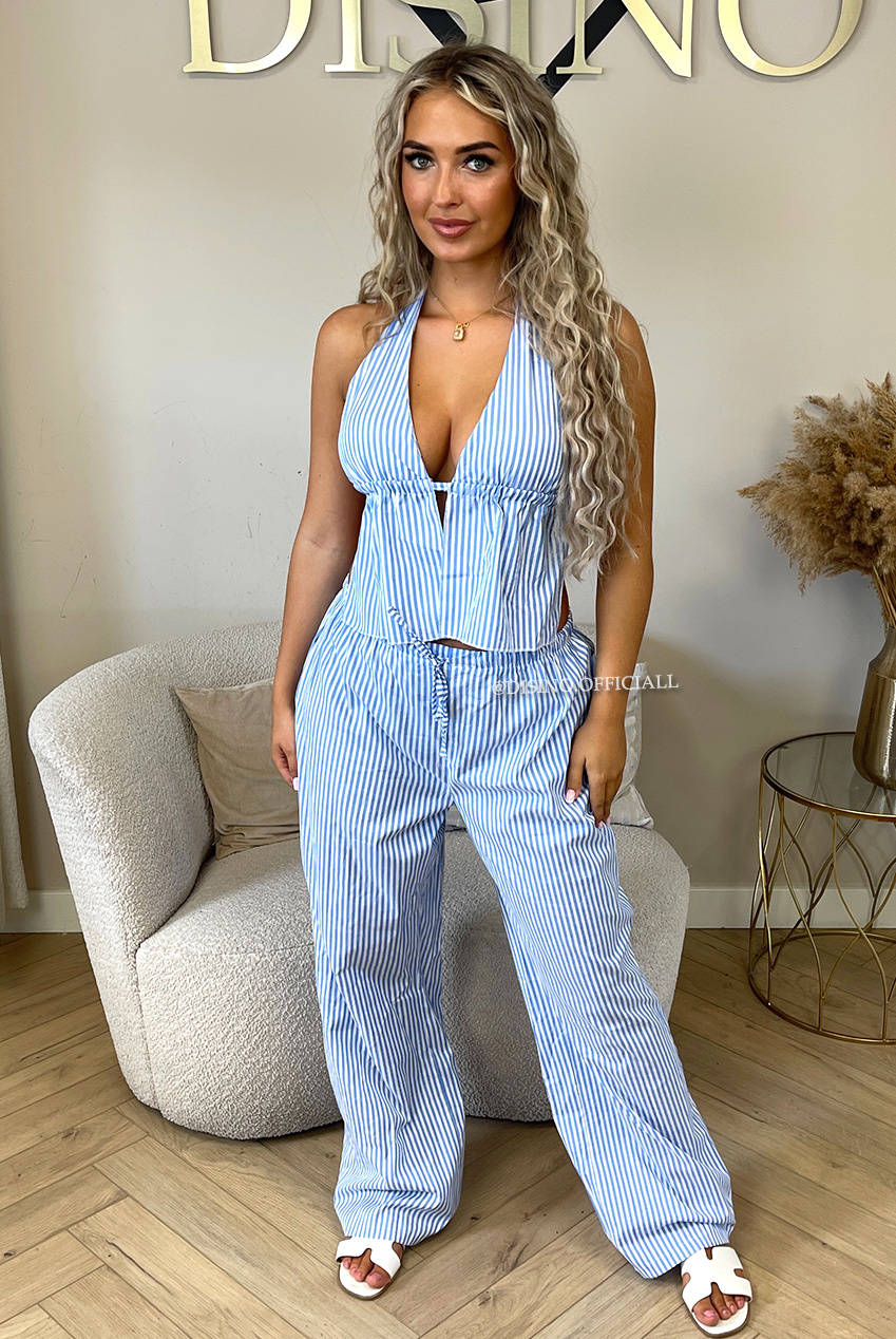 gestreept setje dames, zomer co‑ord blauw wit, luchtige halter top en broek, vakantie set dames, strand outfit 2025, DISINO gestreept setje
