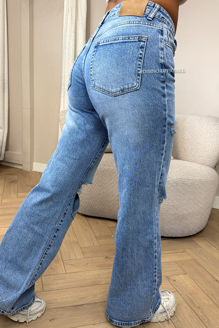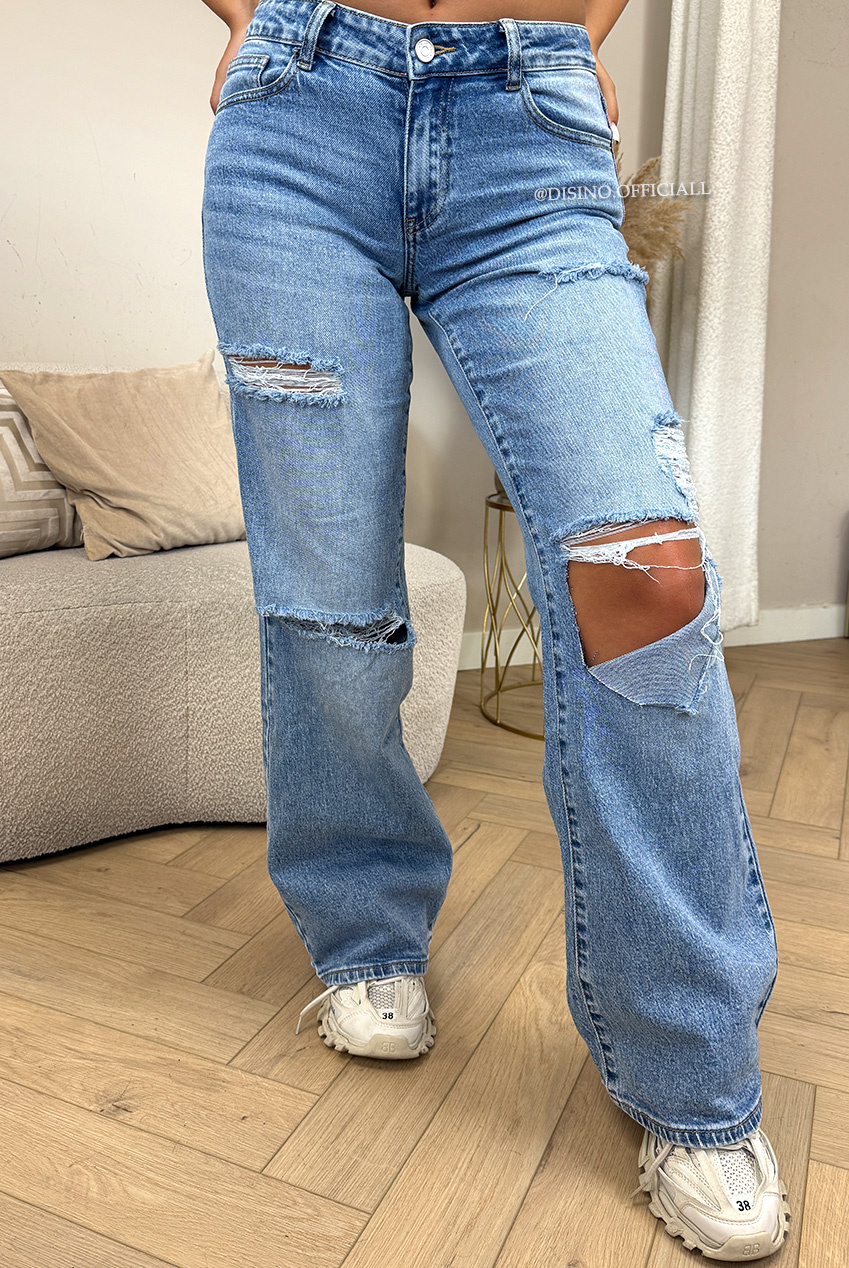 SEO-zoektermen: mid-waist wide leg jeans dames, ripped jeans met stretch, blauwe jeans met gaten, trendy denim 2025, destroyed jeans dames, Dublin jeans DISINO.