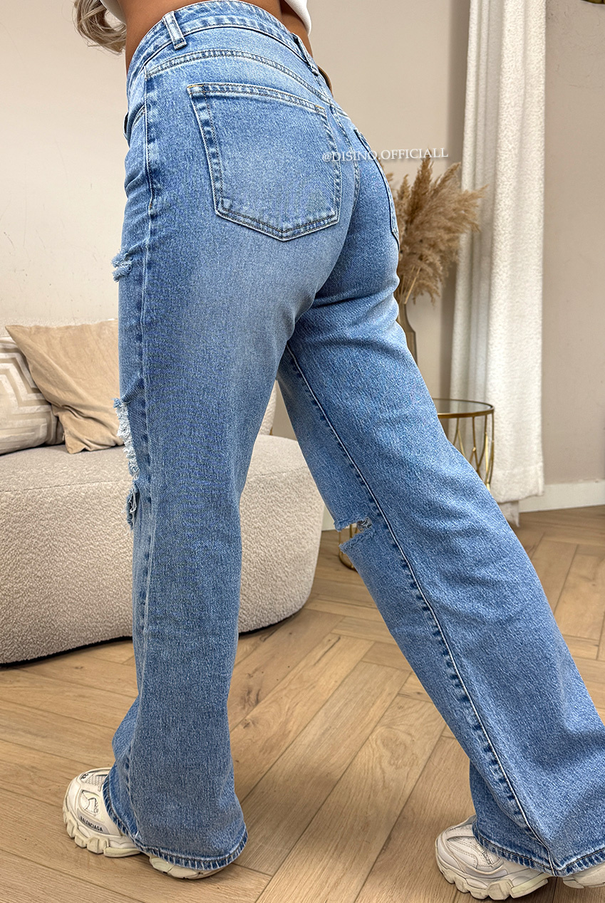 BLUE - 'DUBLIN V2' - MID-WAIST STRETCH RIPPED KNEE BOYFRIEND JEANS