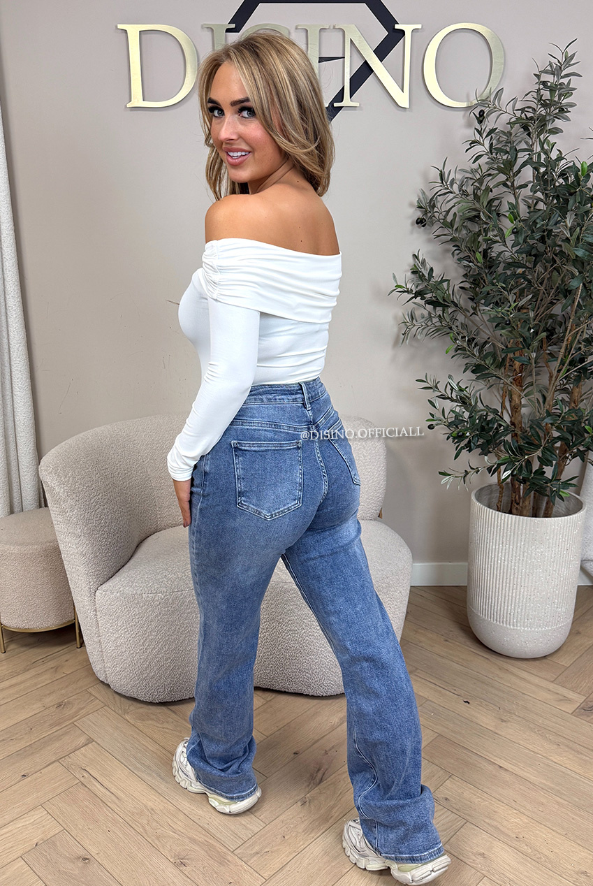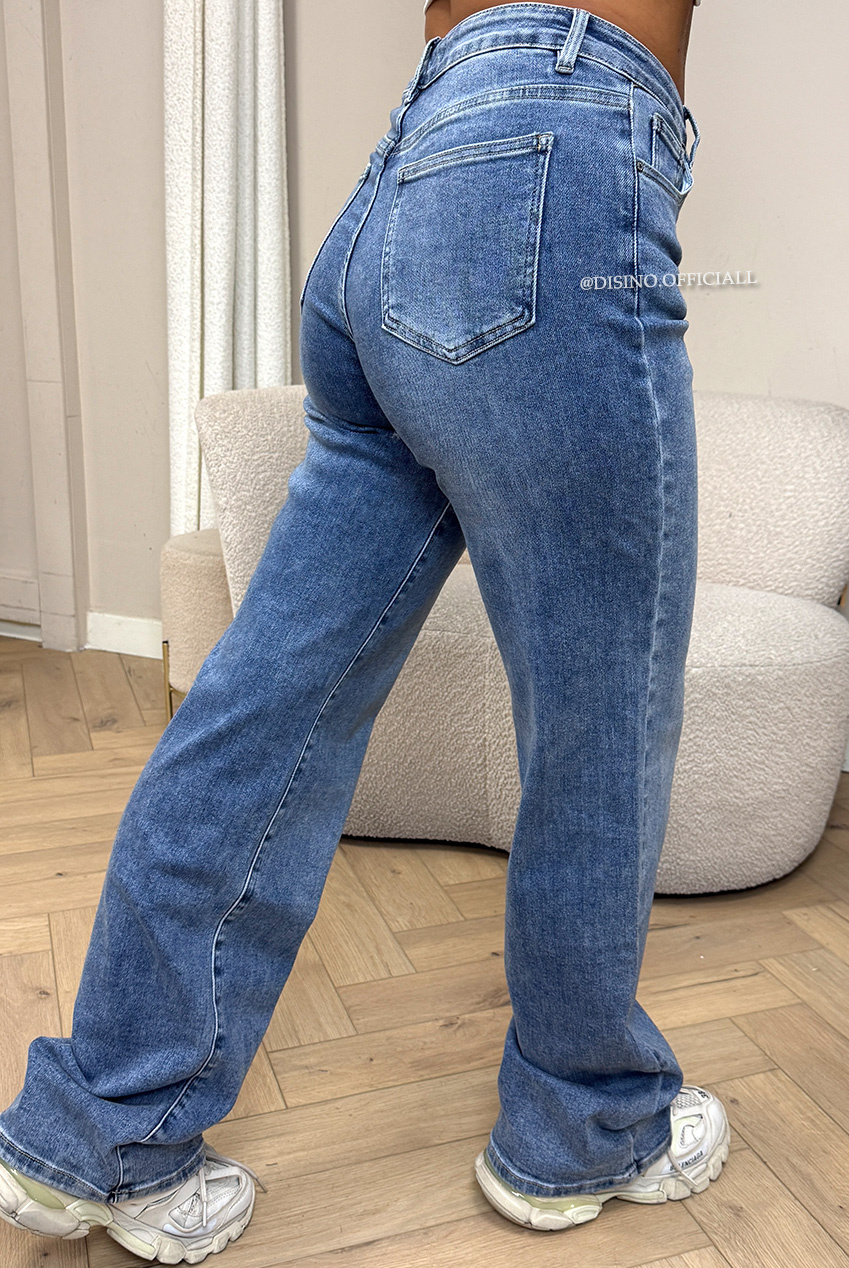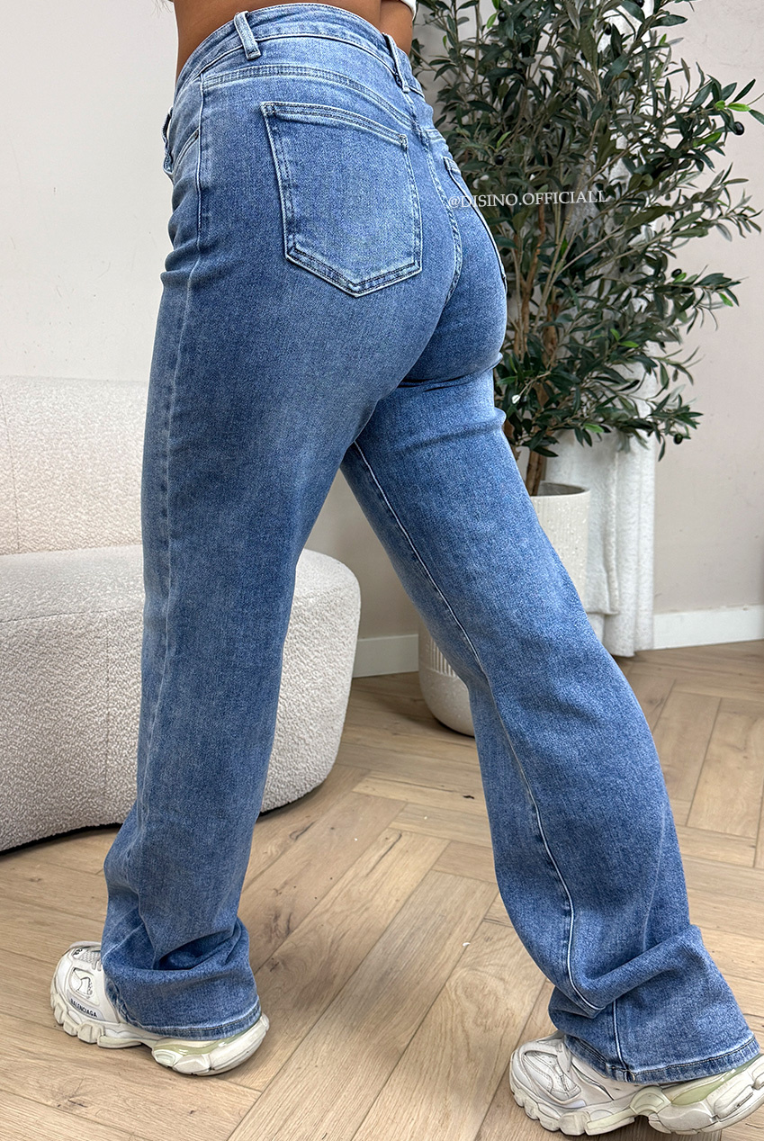 SEO-zoektermen: blue wide leg jeans dames, extra long jeans dames, stretch denim dames, wide leg denim dames, long wide leg denim, DISINO jeans.