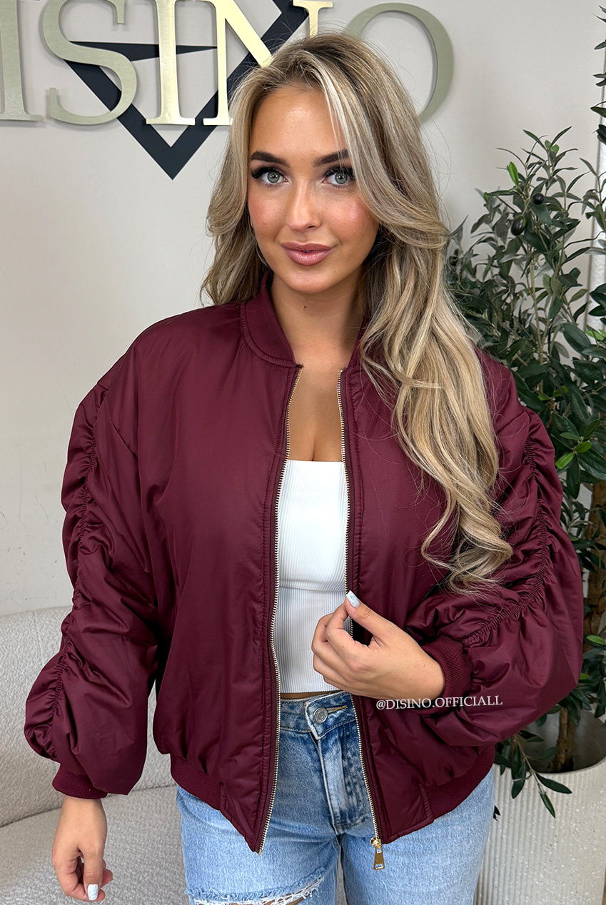SEO-zoektermen: oversized bomber jacket dames, bordeaux bomber jas, trendy bomber 2025, stoere bomber met ruches, bomber jacket oversized fit, DANI bomber DISINO