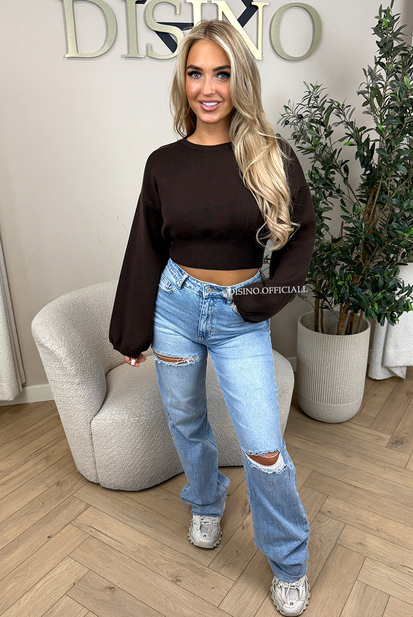choco cropped knit, basic knit dames, trui met ballonmouwen choco, cropped sweater dames, knit top dames herfst, trendy knit DISINO, choco knit top, cropped pullover dames