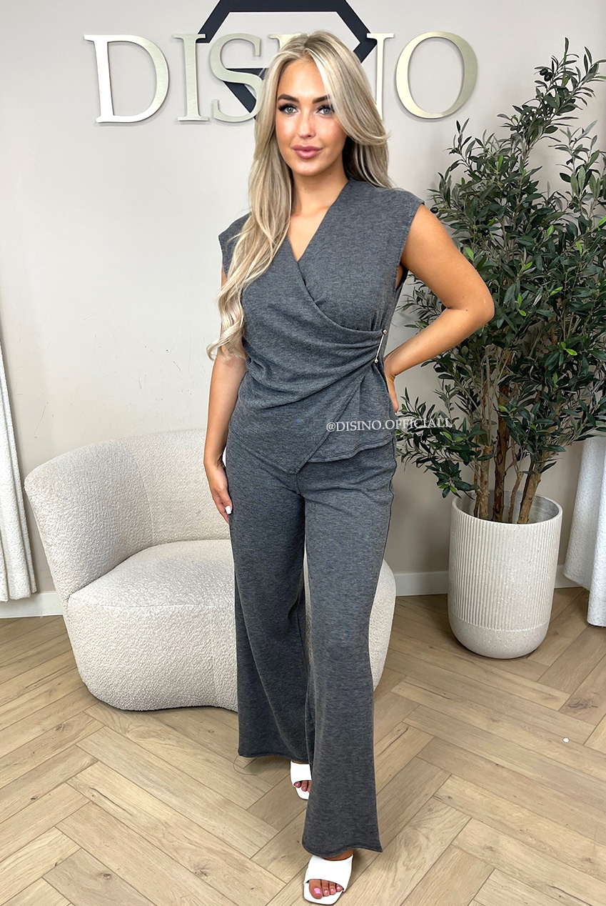Bordeaux set dames, overslag top set, comfy chic set, Aurora set DISINO, wide leg grey broek dames, lounge set chic, two piece set, Zara viral set