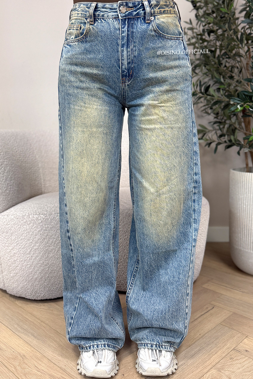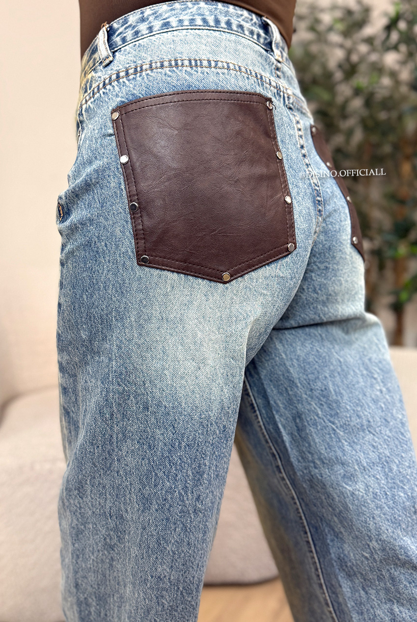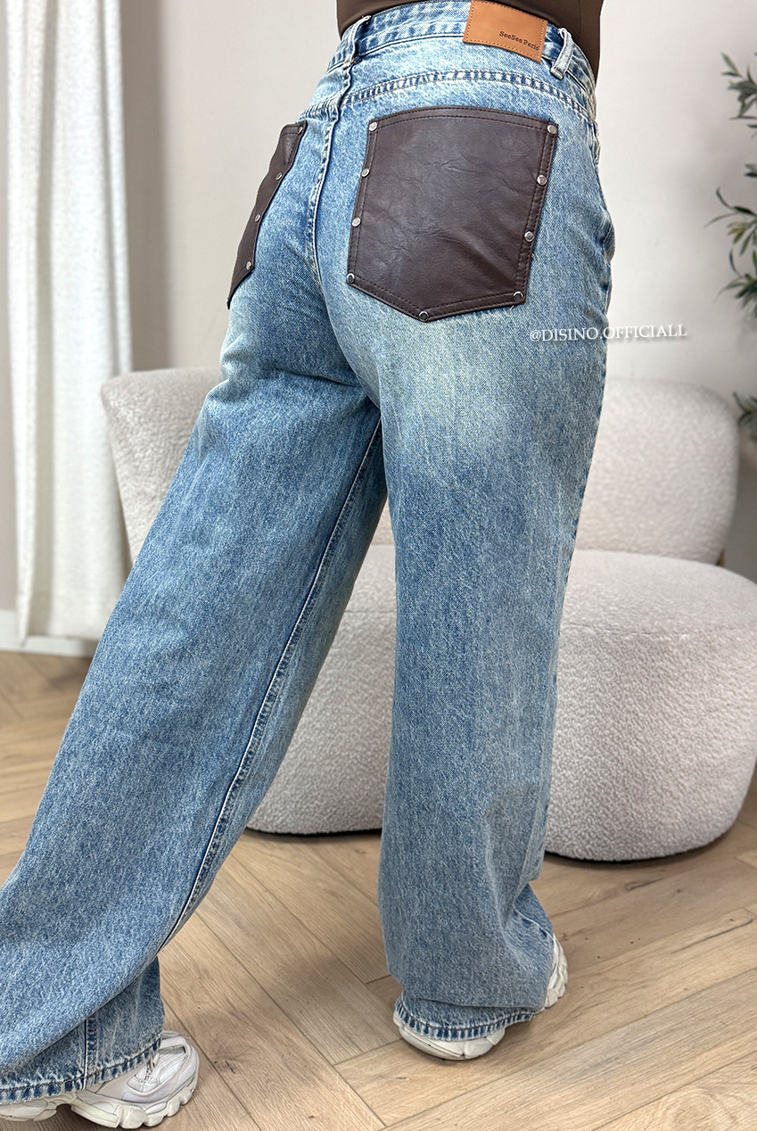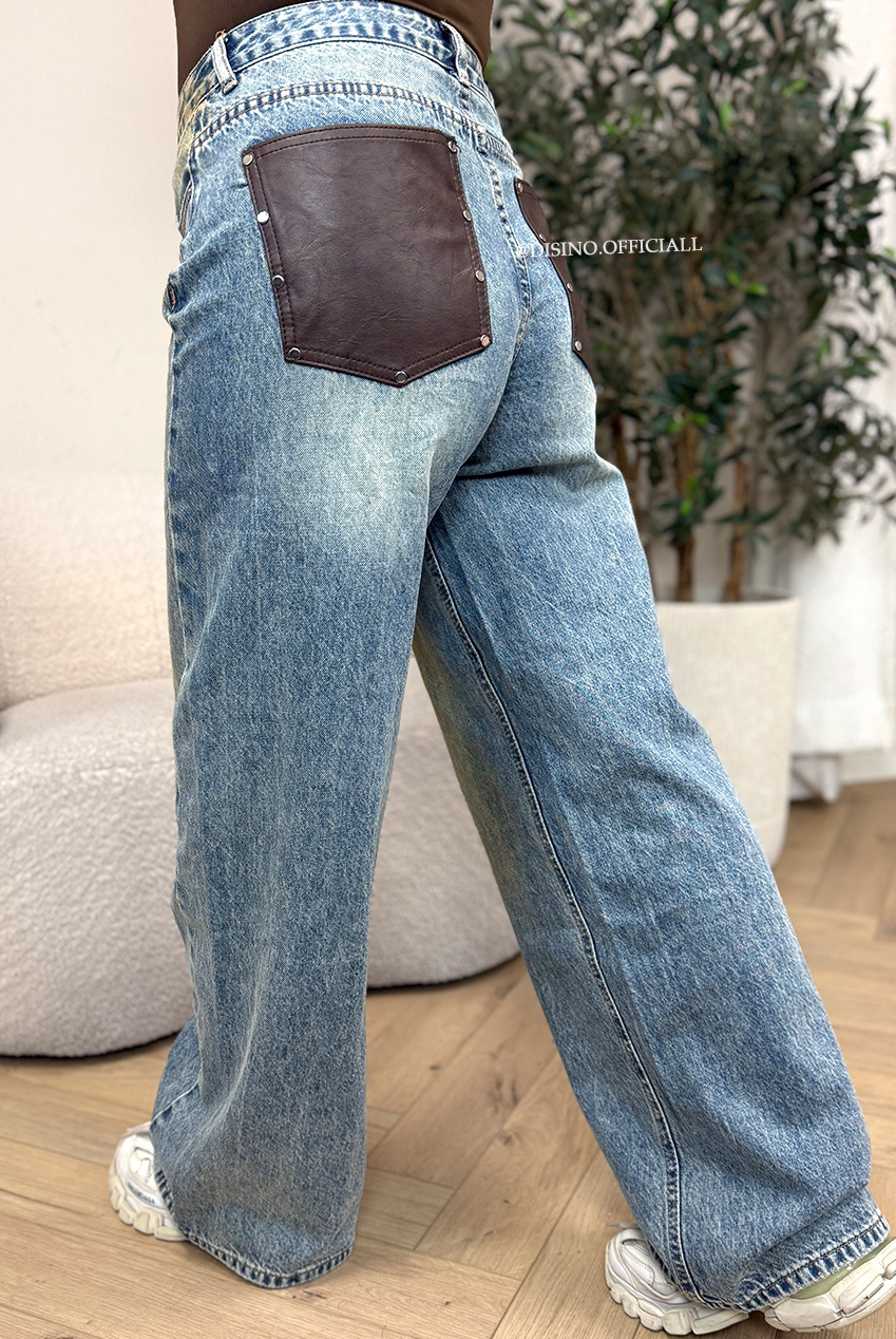 SEO-zoektermen: dirty blue jeans dames, leather pocket jeans, baggy jeans dames, wide leg jeans dames, viral jeans, jeans met leren zakken, high waist baggy jeans, DISINO denim.