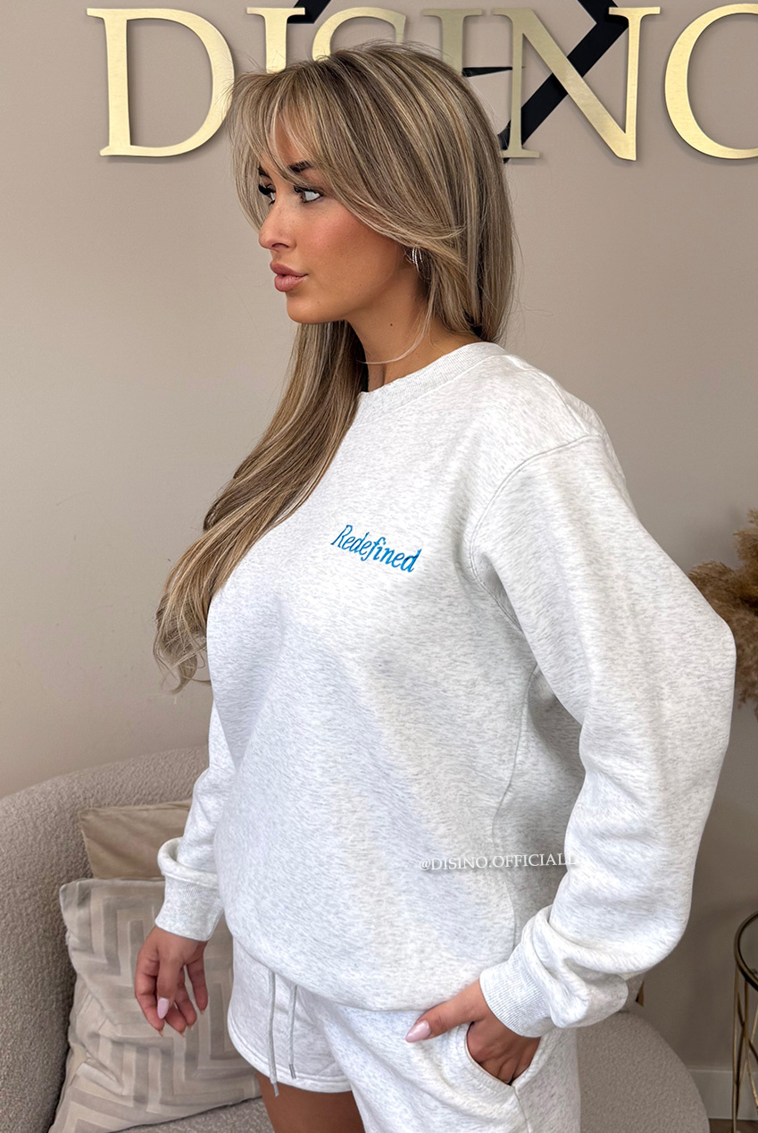 REDEFINED COMFORT! Deze jogger set in het lichtgrijs is hét bewijs dat comfy ook super cute kan zijn! De cropped sweater met het geborduurde "Redefined"-detail en de bijpassende shorts met trekkoord creëren samen een speelse, sporty look. De stof is zacht, dik en voelt premium aan, ideaal voor chilldagen, airport outfits of een casual brunchdate met je bestie.