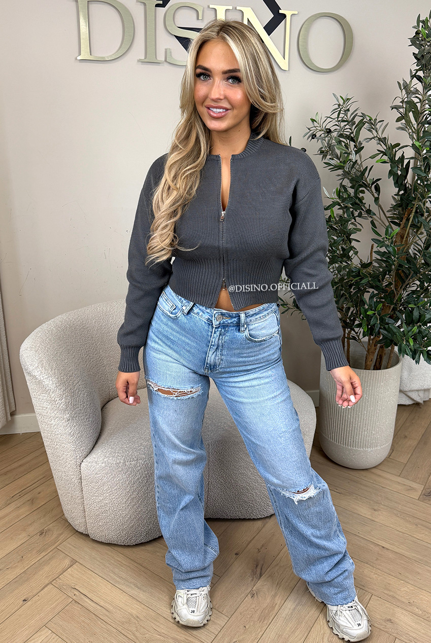 grijze knit dames, cropped knit met rits, grijze trui dames, zipper knit grey, trendy knitwear DISINO, grijze cardigan met rits, knit top dames herfst, basic knit met zipper