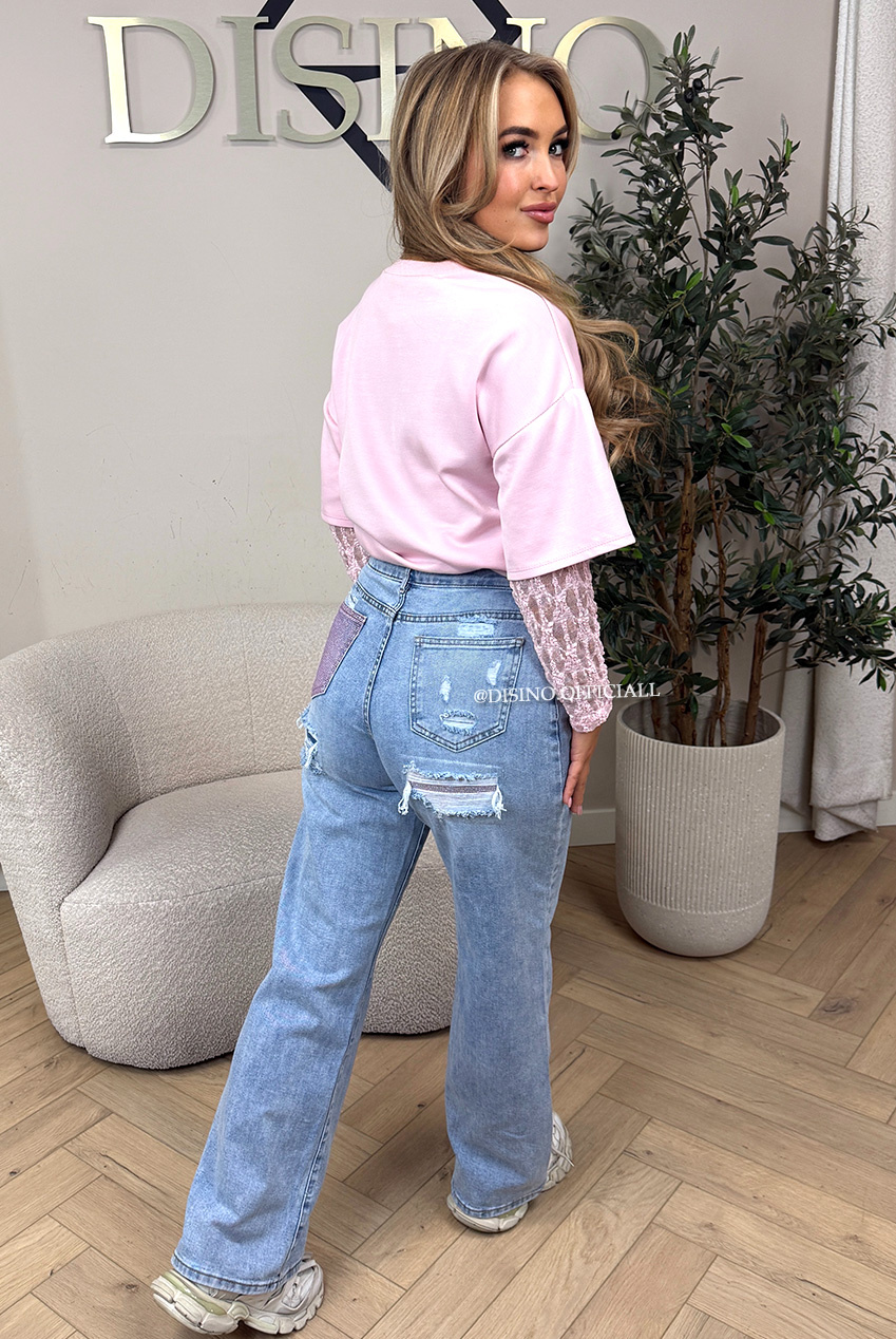 LIGHT BLUE - 'SYDNEY JEANS' - STRETCH VIRAL RIPPED BACK STRAIGHT LEG JEANS