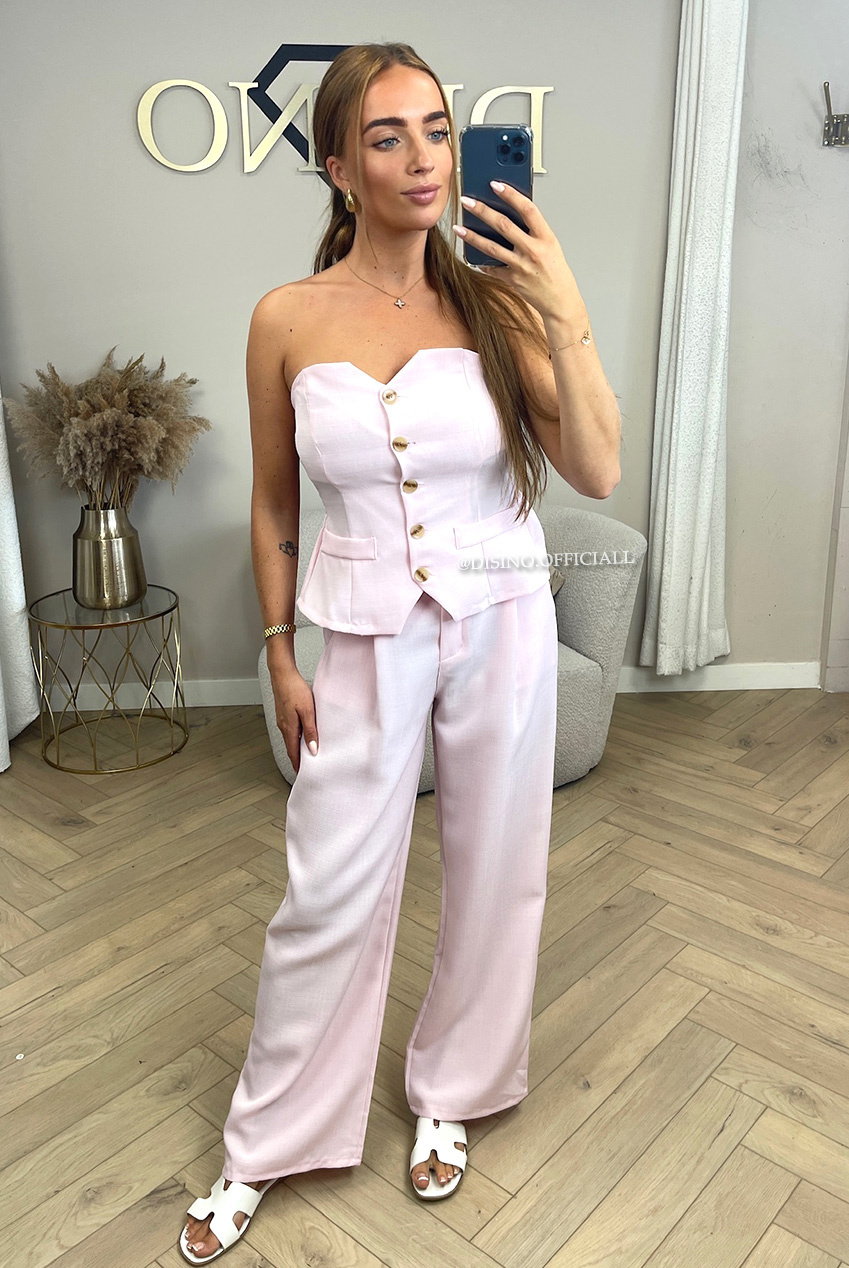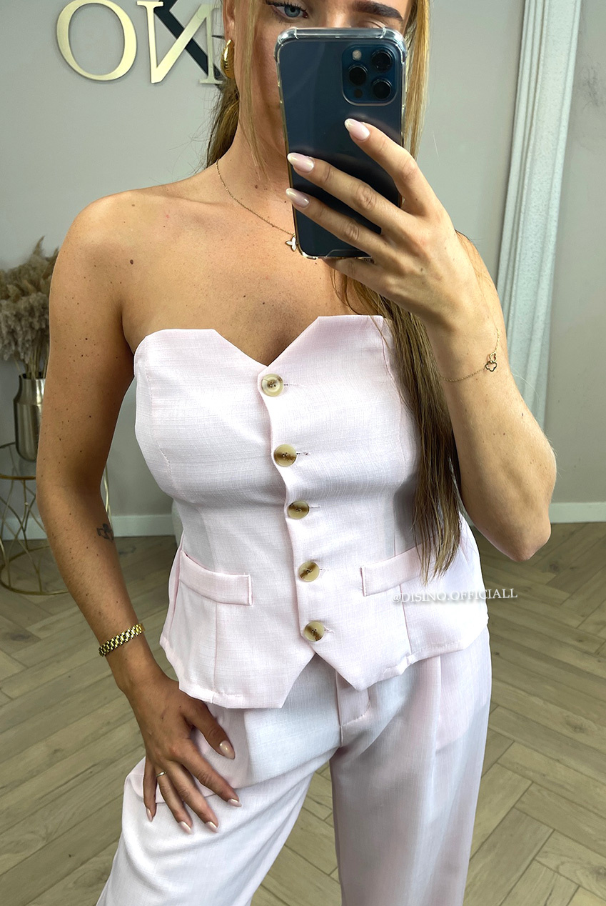 EFFORTLESS ELEGANCE. Zomers, vrouwelijk en helemaal on-trend! Deze zachte roze linnen set bestaat uit een strapless top met een speelse hartvormige halslijn en bijpassende wide leg pants. De top sluit met een knopenrij en heeft een elegante, getailleerde fit die je taille prachtig accentueert. De bijpassende broek valt losjes en zorgt voor een classy, luchtige look.