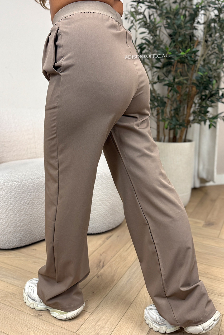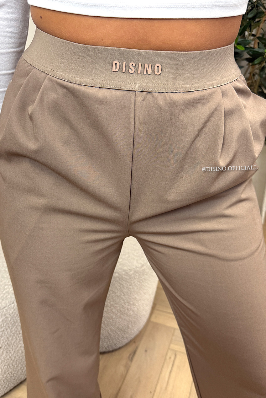 SEO-zoektermen: lounge pants dames, taupe pantalon, comfy broek met logo, designer inspired loungewear, DISINO 3D logo pants, high waist lounge pants, luxe jogging pantalon dames.