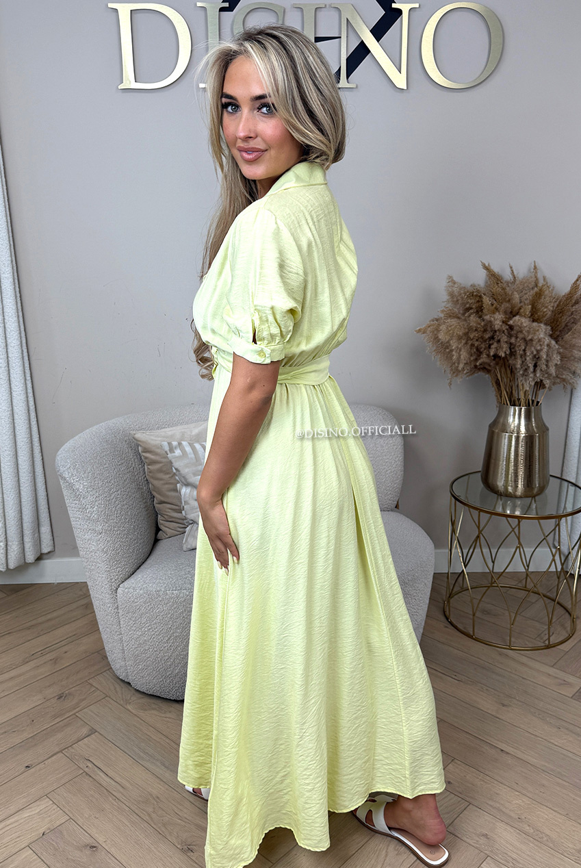 maxi jurk dames, gele zomerjurk, luchtige lange jurk, jurk met ceintuur, blousejurk lang, DISINO zomerjurk, elegante maxi jurk