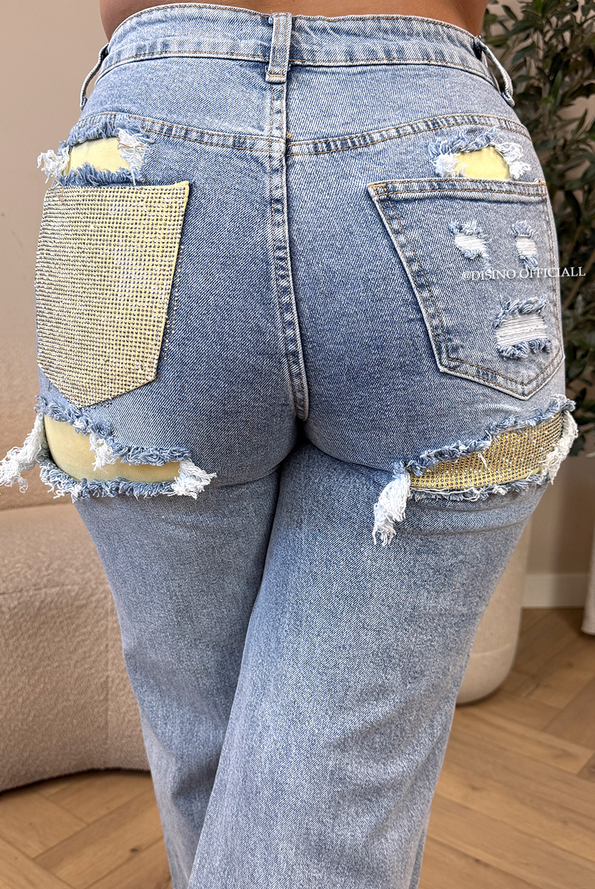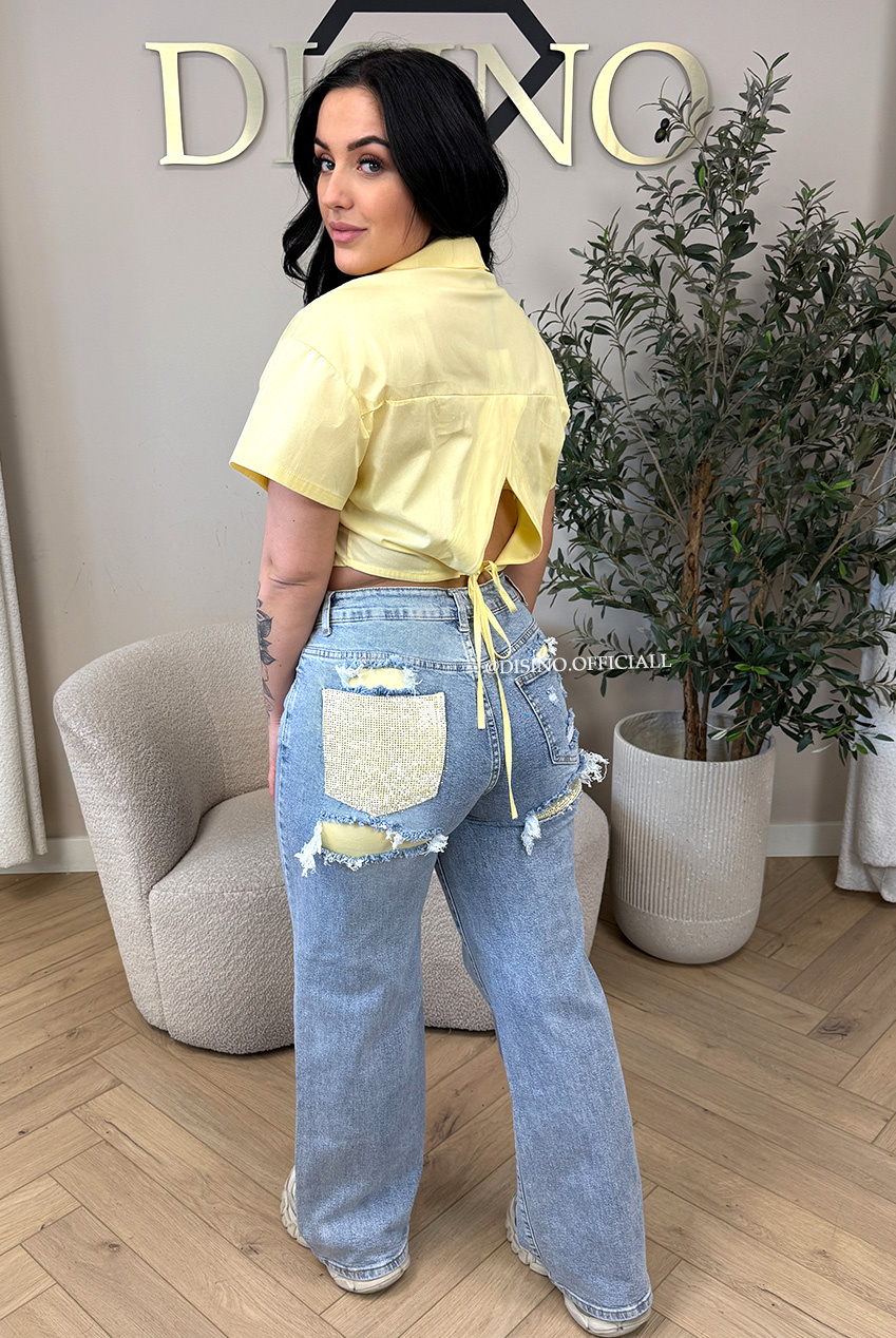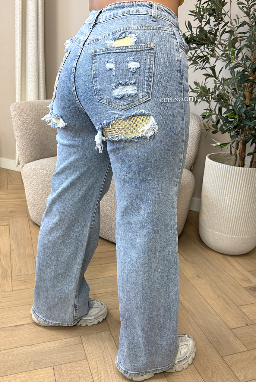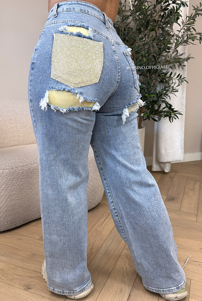 VIRAL RHINESTONE STATEMENT JEANS! De yellow ‘SYDNEY V2’ Jeans is dé viral musthave voor een bold en opvallende look. De combinatie van ripped details en sprankelende rhinestones maakt deze jeans een echte eyecatcher die elke outfit direct een fashion upgrade geeft.